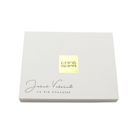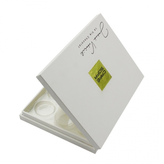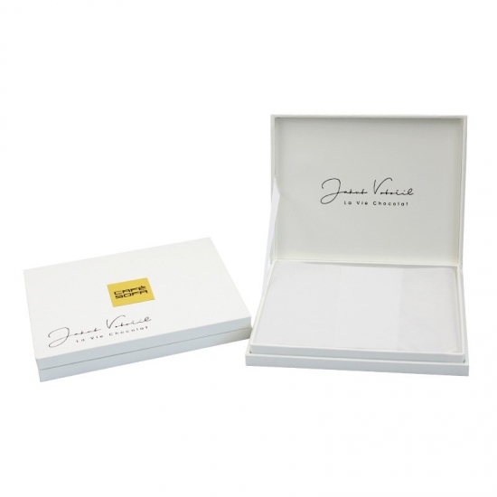 Dit is een witte chocolade geschenkdoos wat maakte van 157g C2S-kunstdrukpapier + 2 mm grijs karton, op de buitenkant van de doos staat een logo met gouden foliedruk, de plastic bak aan de binnenkant van de doos kan naar wens worden vormgegeven.