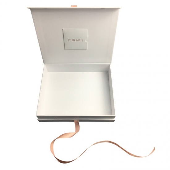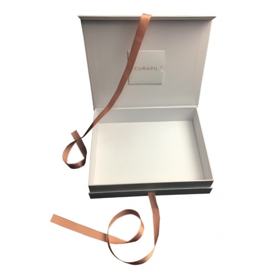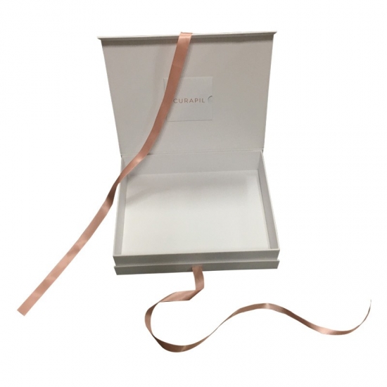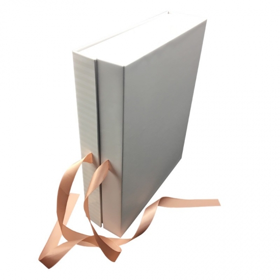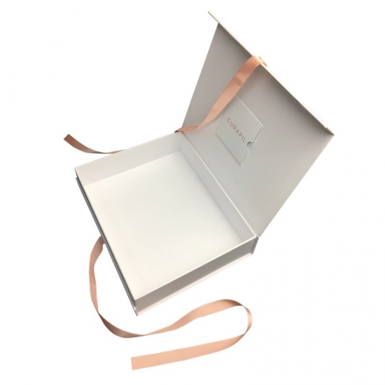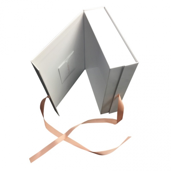 Dit is een witte magnetische geschenkdoos met lint wat maakte van 157g C2S-kunstdrukpapier + 2mm grijs karton, buitenkant van de doos vol met UV-coating waardoor de doos er glanzend en luxe uitziet, binnenkant van het deksel bevestigd klein envelopje om de kaart in te doen.