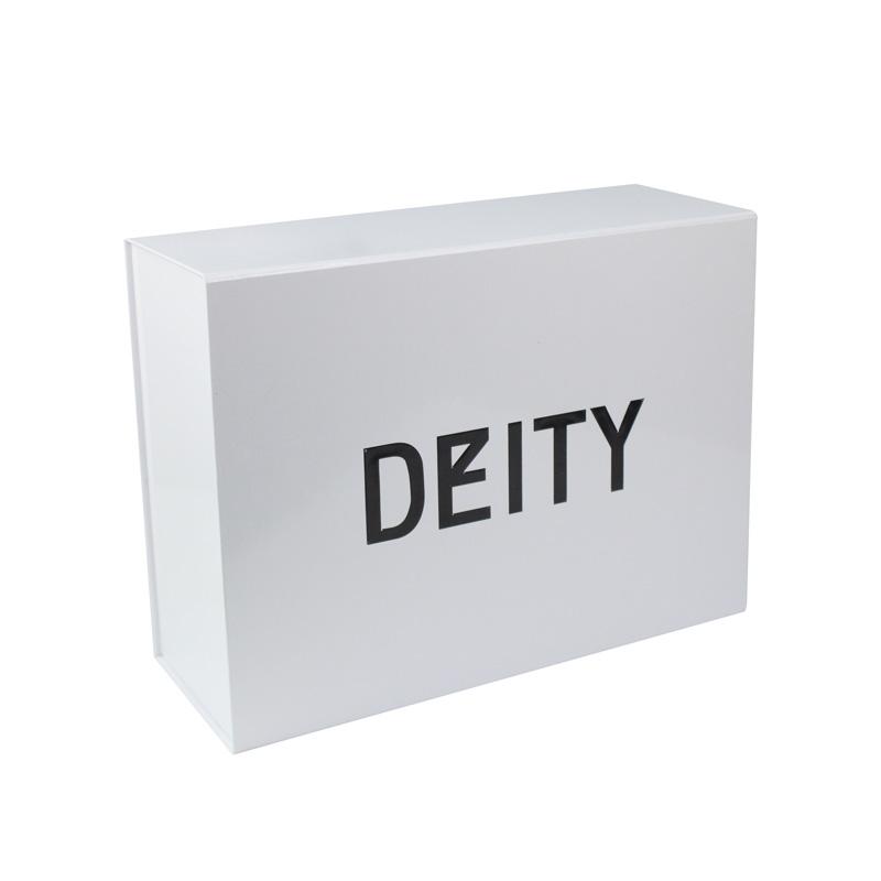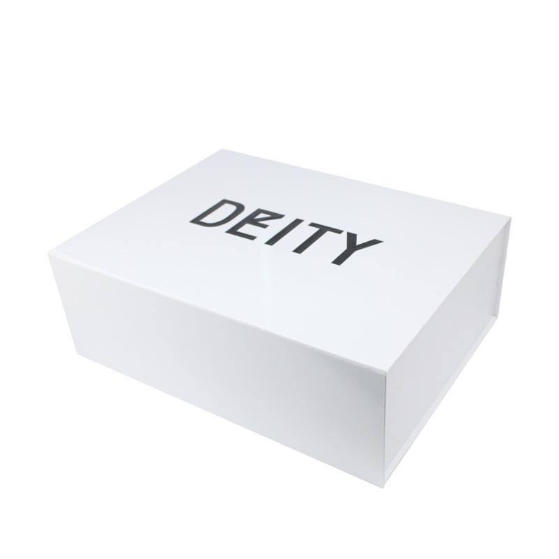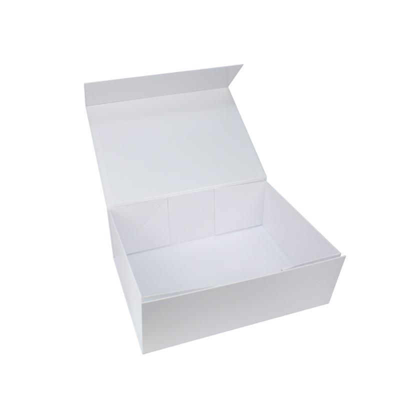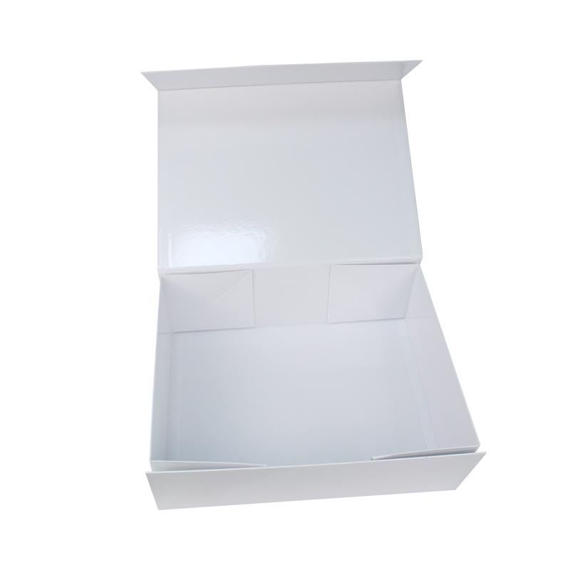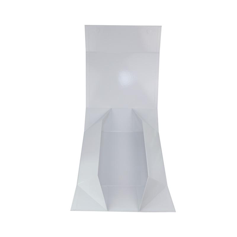 Opvouwbare geschenkdoos in glanzend wit met aangepast logo, formaat, kleur en afwerking. Verdubbel de waarde van uw producten.