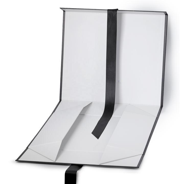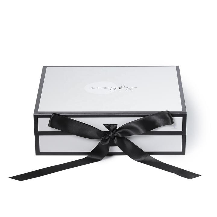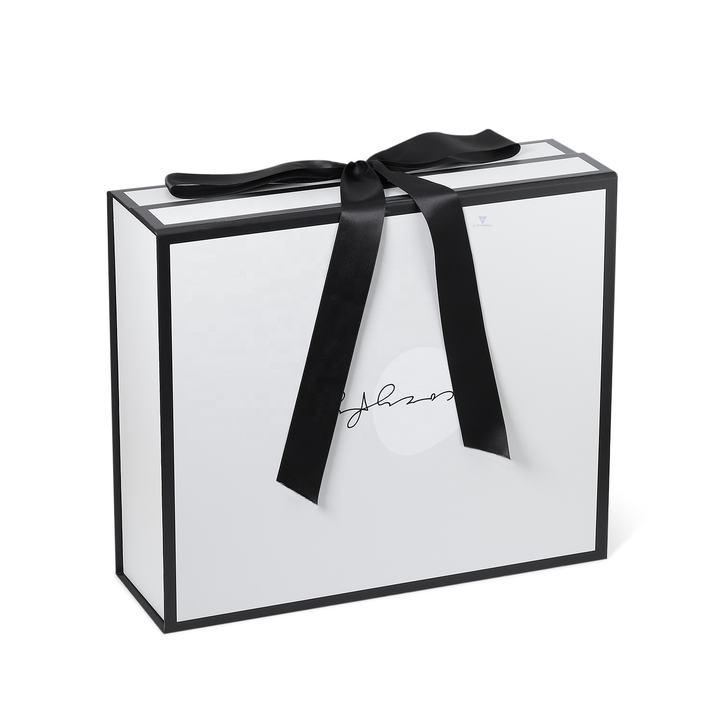 Dit is een grote opvouwbare geschenkdoos met deksels wat maakte door 157g C2S kunstpapier + 1200g grijs karton ,zijn Witte, opvouwbare geschenkdoos met een blauw lint dat past bij de kleur van het logo op de bovenkant van de doos.