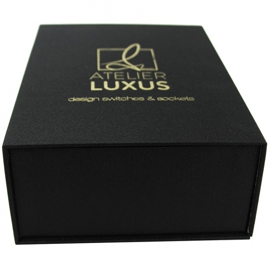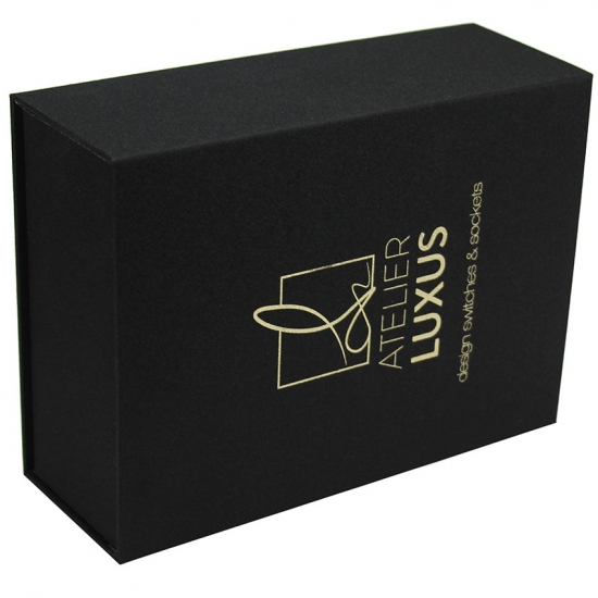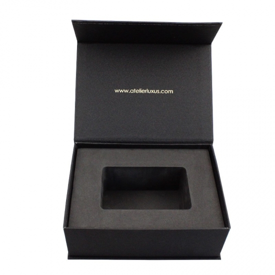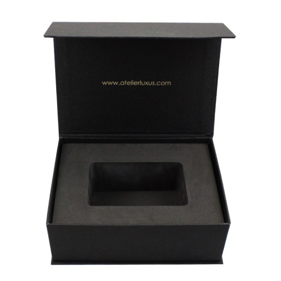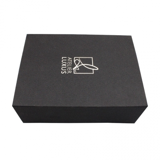 Zwarte flip-geschenkdoos gemaakt van 157 g/m² C2S-kunstdrukpapier gelamineerd met 2 mm grijs karton met EVA-schuimondersteuning, aangepast in elke gewenste maat, kleur en logo. Oppervlakteafwerking was matte laminering met hete stempeling. Afmetingen: 21 * 15,5 * 7,5 cm.
