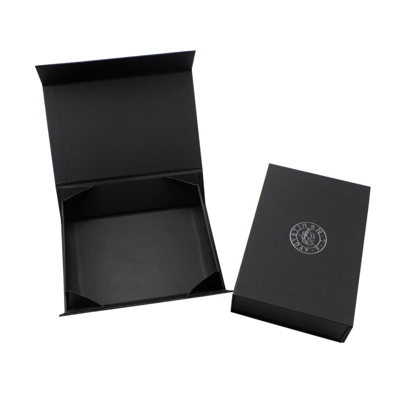 Dit is een zwarte klassieke luxe zwarte platte geschenkdozen groothandel geschenkvouwdoos met een zilverfolie-logo, geschikt voor de verpakking van schoonheidsproducten
